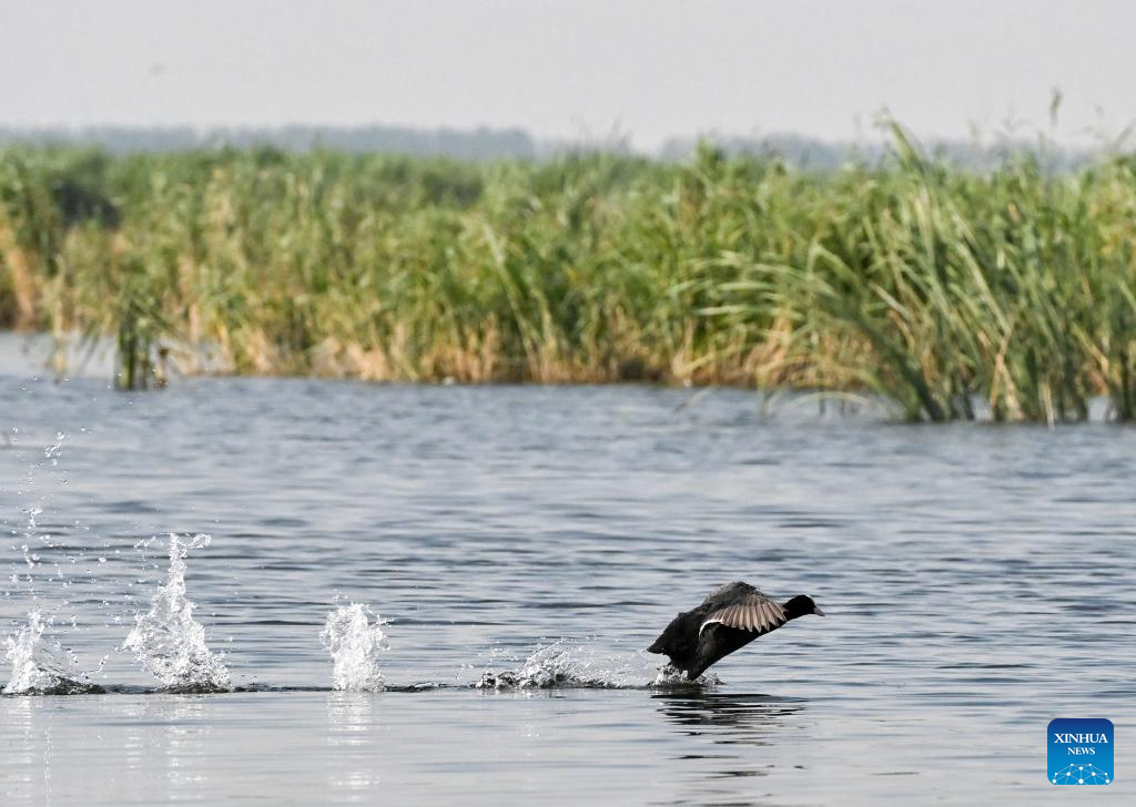 A bird is pictured at Baiyangdian Lake in Xiong'an New Area, north China's Hebei Province, July 19, 2023. The Baiyangdian Lake, the largest wetland ecosystem in northern China, is located in Xiong'an. After the establishment of the new area, the water quality in Baiyangdian has improved from below Level V, the lowest of China's five-tier water assessment system, to Level III. The area of Baiyangdian has been restored from about 170 square kilometers to about 290 square kilometers, and the water level in the lake area has remained stable at about 7.2 meters. (Xinhua/Hao Jianwei)
