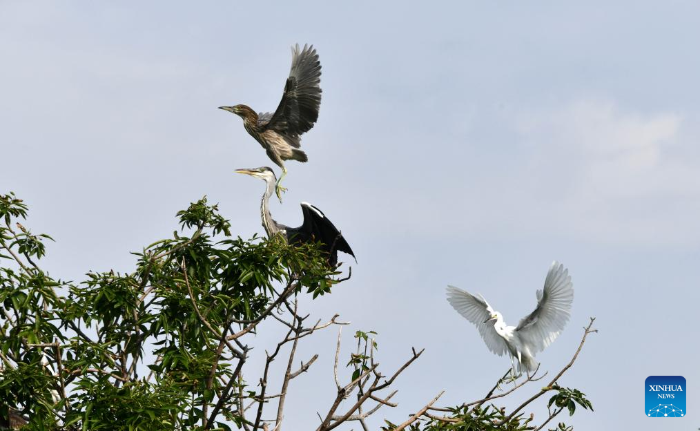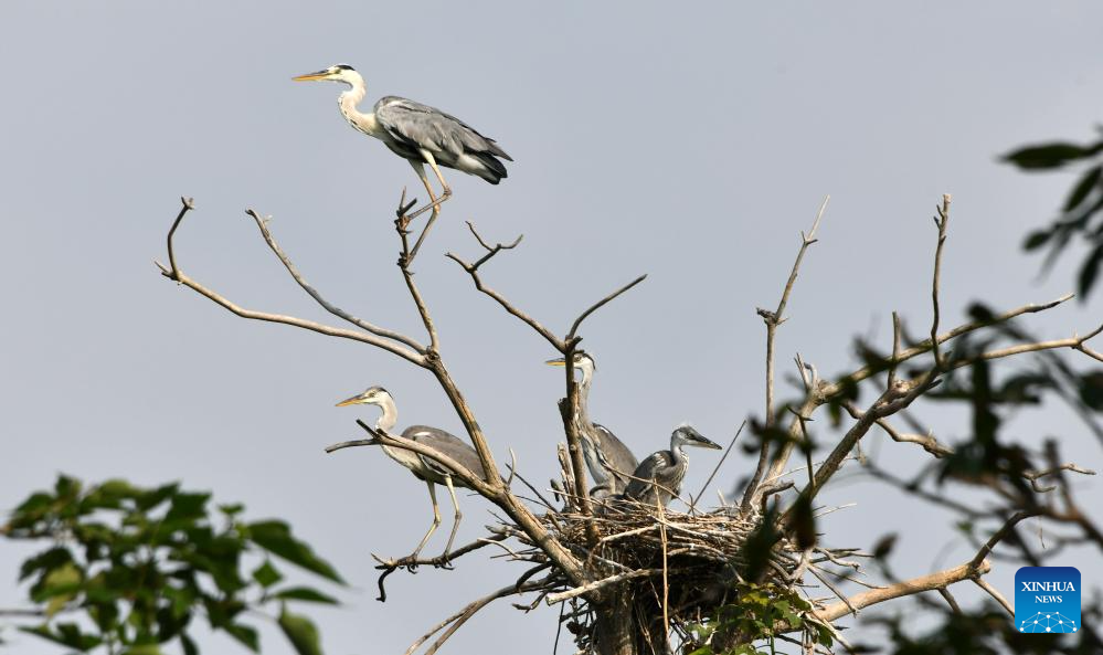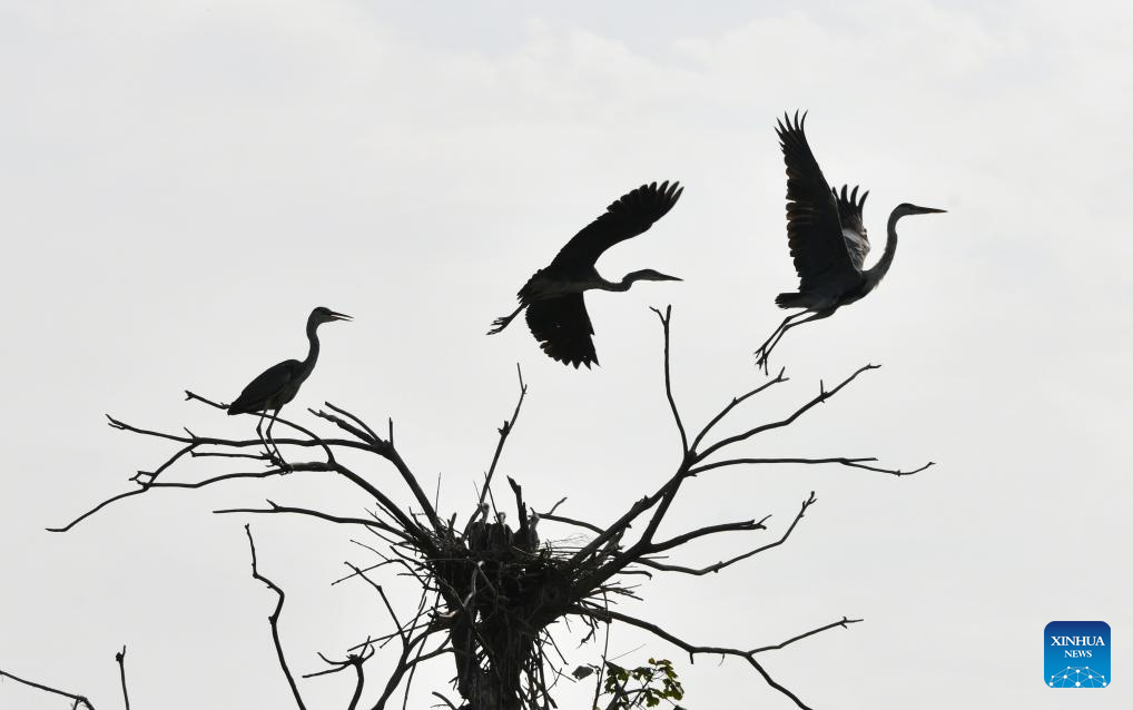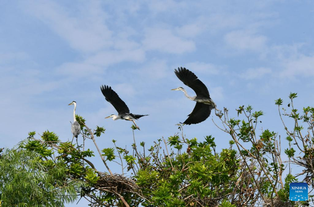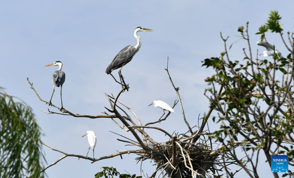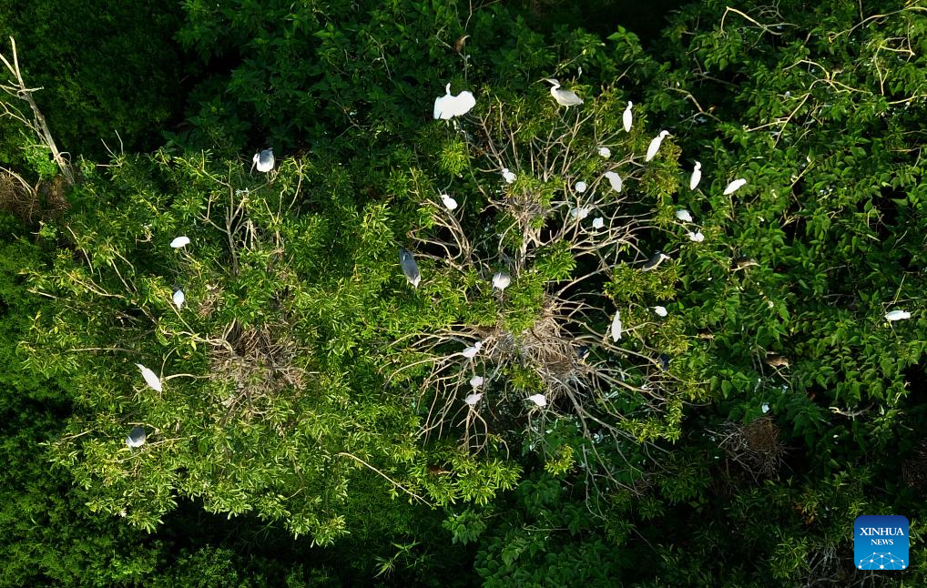 This aerial photo taken on Aug. 9, 2023 shows herons on the trees at a wetland in Wenting Lake of Chengwu county, Heze city, east China's Shandong Province. In recent years, Chengwu has improved the ecological environment of local wetlands which become a paradise for wild birds. (Xinhua/Xu Suhui)