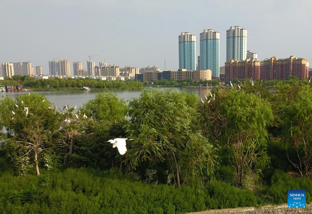Birds are pictured at Baiyangdian Lake in Xiong'an New Area, north China's Hebei Province, July 19, 2023. The Baiyangdian Lake, the largest wetland ecosystem in northern China, is located in Xiong'an. After the establishment of the new area, the water quality in Baiyangdian has improved from below Level V, the lowest of China's five-tier water assessment system, to Level III. The area of Baiyangdian has been restored from about 170 square kilometers to about 290 square kilometers, and the water level in the lake area has remained stable at about 7.2 meters. (Xinhua/Hao Jianwei)