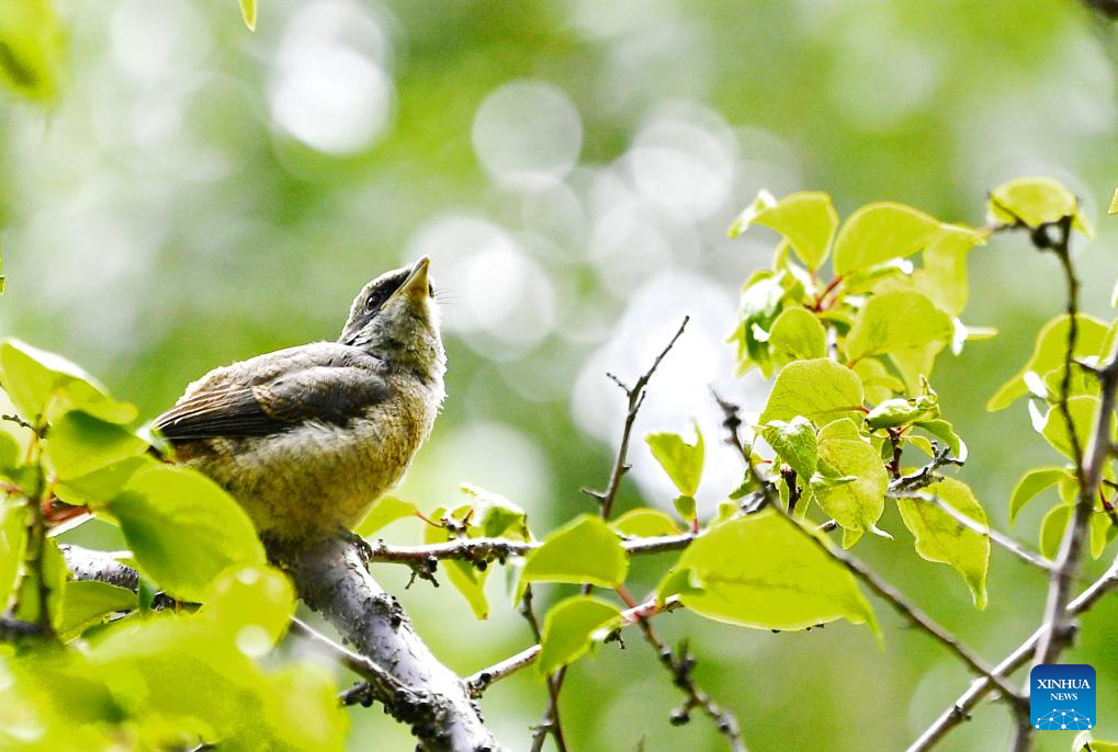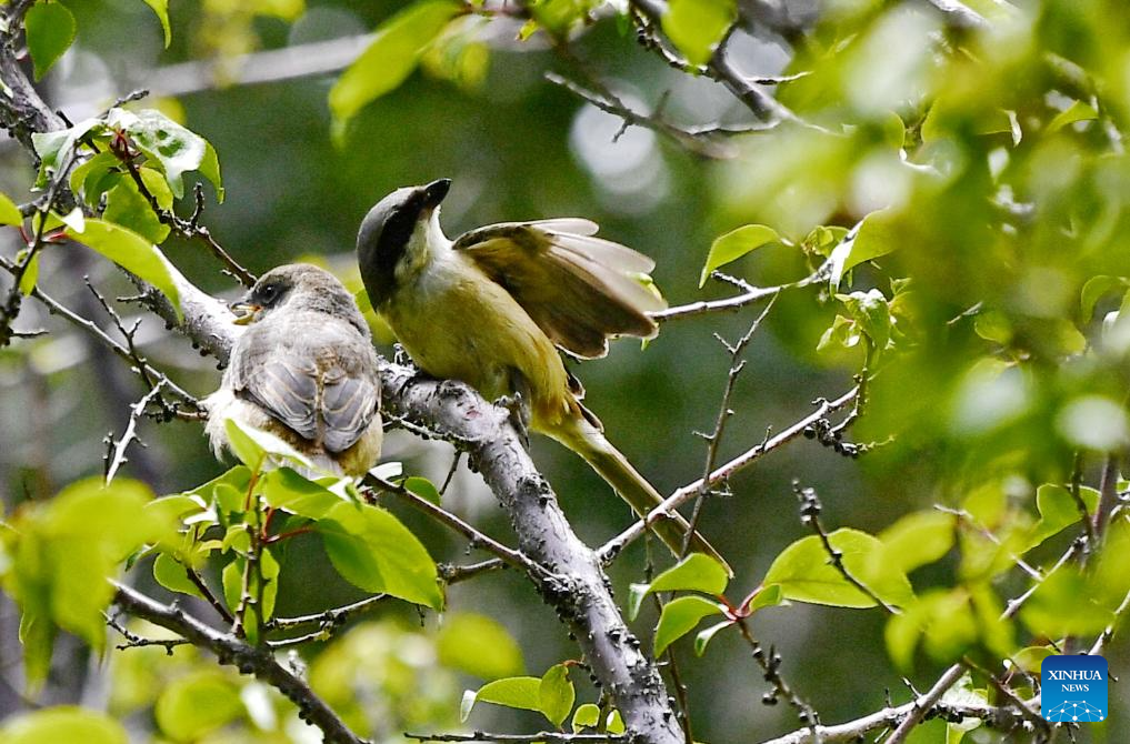 This photo taken on July 28, 2023 shows a shrike (right) and a baby bird on a tree branch in Chengguan District of Lhasa, southwest China's Tibet Autonomous Region. Trees at parks and gardens in Lhasa have been home for birds. In recent years, various measures have been taken to improve the urban and rural environment in Lhasa, which becomes a green and eco-friendly city. (Xinhua/Zhang Rufeng)