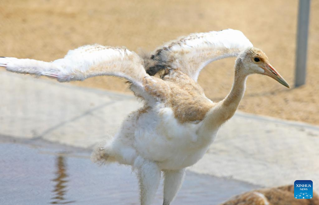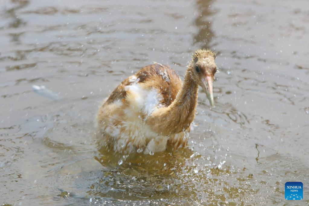 A baby red-crowned crane is pictured in a crane breeding and protection station under the Forestry and Wetland Protection Service Center in Panjin City, northeast China's Liaoning Province, Aug. 3, 2023. The crane breeding and protection station has bred 85 baby red-crowned cranes so far this year. The baby cranes will go through wild training when they're about 60 days old. (Xinhua/Chen Wei)