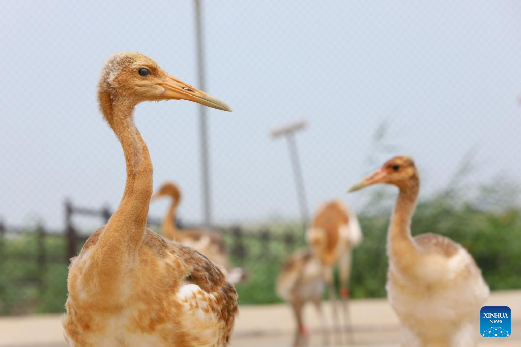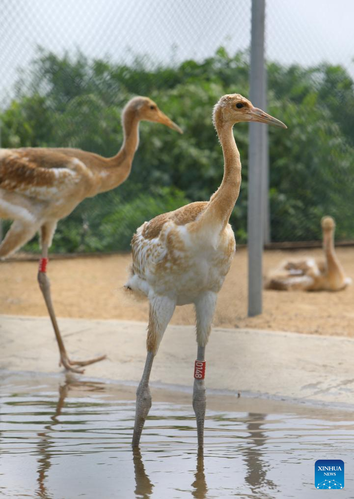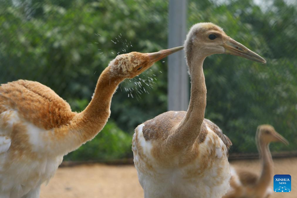 Baby red-crowned cranes are pictured in a crane breeding and protection station under the Forestry and Wetland Protection Service Center in Panjin City, northeast China's Liaoning Province, Aug. 3, 2023. The crane breeding and protection station has bred 85 baby red-crowned cranes so far this year. The baby cranes will go through wild training when they're about 60 days old. (Xinhua/Chen Wei)