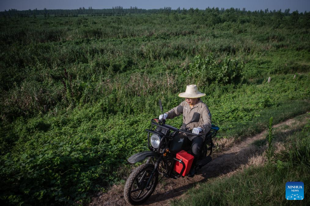 Ranger Wang Chuanjun patrols Shishou Milu Deer National Nature Reserve in central China's Hubei Province, Aug. 1, 2023. Milu deer at Shishou Milu Deer National Nature Reserve mate between June and August every year, during which the males fight each other for the privilege to stay together with as many females as they wish. To ensure a safe and tranquil environment for their reproduction, rangers here have been spending more time and efforts patrolling the nature reserve during this period. After years of efforts by protectors and continuous improvement of the local ecological environment, the population of milu deer at the nature reserve has increased rapidly, nearing 2,000 to date. There are more than 10 naturally formed breeding groups in varying sizes among these milu deer, and more baby milu deer are expected to come to the world after mating season this year. (Xinhua/Wu Zhizun)