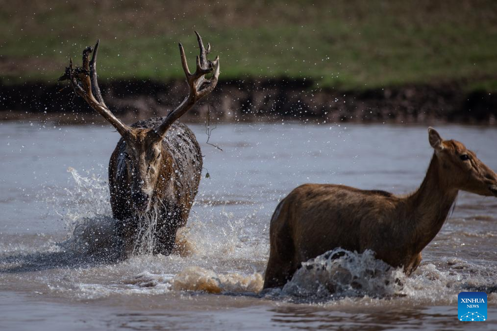 A male milu deer chases a female one at Shishou Milu Deer National Nature Reserve in central China's Hubei Province, Aug. 1, 2023. Milu deer at Shishou Milu Deer National Nature Reserve mate between June and August every year, during which the males fight each other for the privilege to stay together with as many females as they wish. To ensure a safe and tranquil environment for their reproduction, rangers here have been spending more time and efforts patrolling the nature reserve during this period. After years of efforts by protectors and continuous improvement of the local ecological environment, the population of milu deer at the nature reserve has increased rapidly, nearing 2,000 to date. There are more than 10 naturally formed breeding groups in varying sizes among these milu deer, and more baby milu deer are expected to come to the world after mating season this year. (Xinhua/Wu Zhizun)