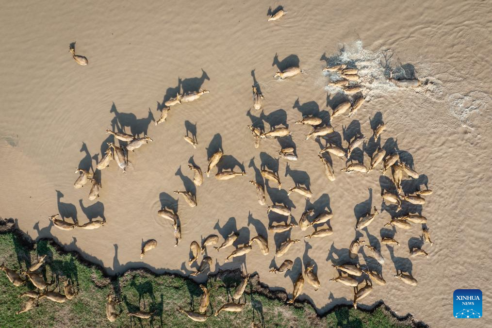 This aerial photo taken on Aug. 1, 2023 shows a male milu deer (upper right corner) chasing a herd of female ones at Shishou Milu Deer National Nature Reserve in central China's Hubei Province. Milu deer at Shishou Milu Deer National Nature Reserve mate between June and August every year, during which the males fight each other for the privilege to stay together with as many females as they wish. To ensure a safe and tranquil environment for their reproduction, rangers here have been spending more time and efforts patrolling the nature reserve during this period. After years of efforts by protectors and continuous improvement of the local ecological environment, the population of milu deer at the nature reserve has increased rapidly, nearing 2,000 to date. There are more than 10 naturally formed breeding groups in varying sizes among these milu deer, and more baby milu deer are expected to come to the world after mating season this year. (Xinhua/Wu Zhizun)