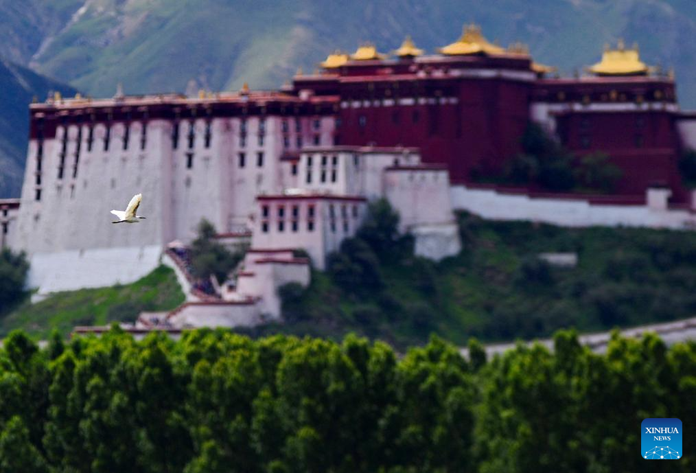 An egret flies over the Lhalu wetland in Lhasa, southwest China's Tibet Autonomous Region, July 23, 2023. The Lhalu wetland national nature reserve, with an average altitude of 3,645 meters, covers an area of 12.2 square kilometers. The wetland's ecological conditions improved as conservation efforts were stepped up. (Xinhua/Zhang Rufeng)