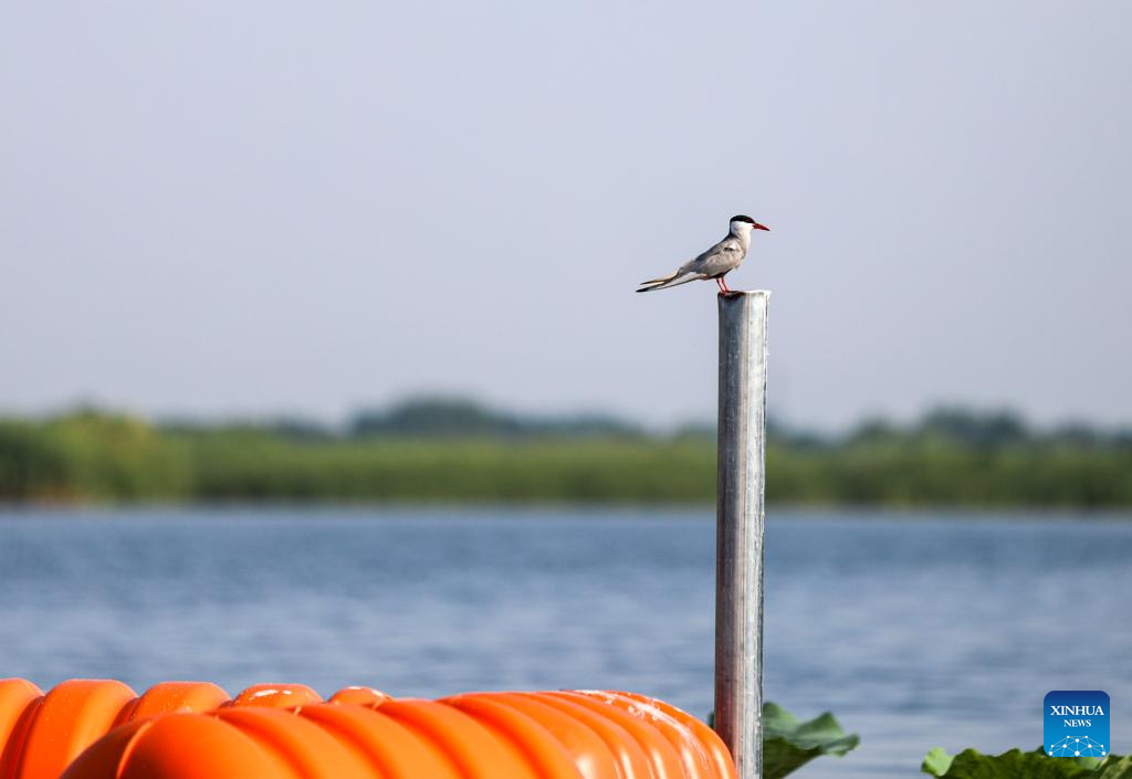 A bird perches on a metal pole at Baiyangdian Lake in Xiong'an New Area, north China's Hebei Province, July 19, 2023. The Baiyangdian Lake, the largest wetland ecosystem in northern China, is located in Xiong'an. After the establishment of the new area, the water quality in Baiyangdian has improved from below Level V, the lowest of China's five-tier water assessment system, to Level III. The area of Baiyangdian has been restored from about 170 square kilometers to about 290 square kilometers, and the water level in the lake area has remained stable at about 7.2 meters. (Xinhua/Gao Junfeng)