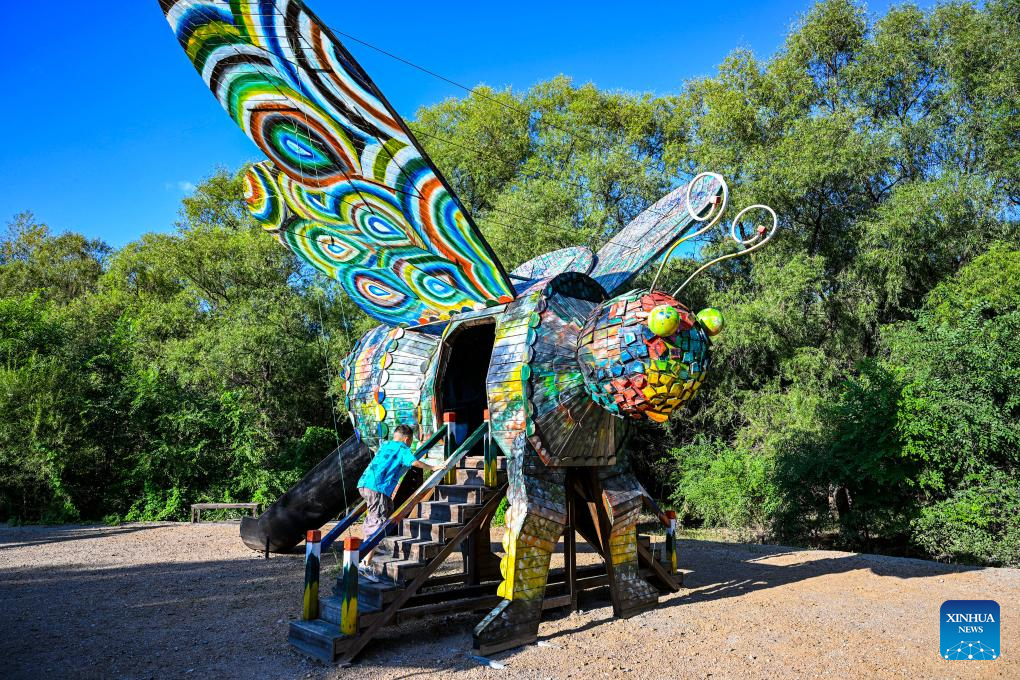 People have fun at the Tao'erhe National Wetland Park in Ulanhot City, north China's Inner Mongolia Autonomous Region, Aug. 13, 2023. (Xinhua/Peng Yuan)