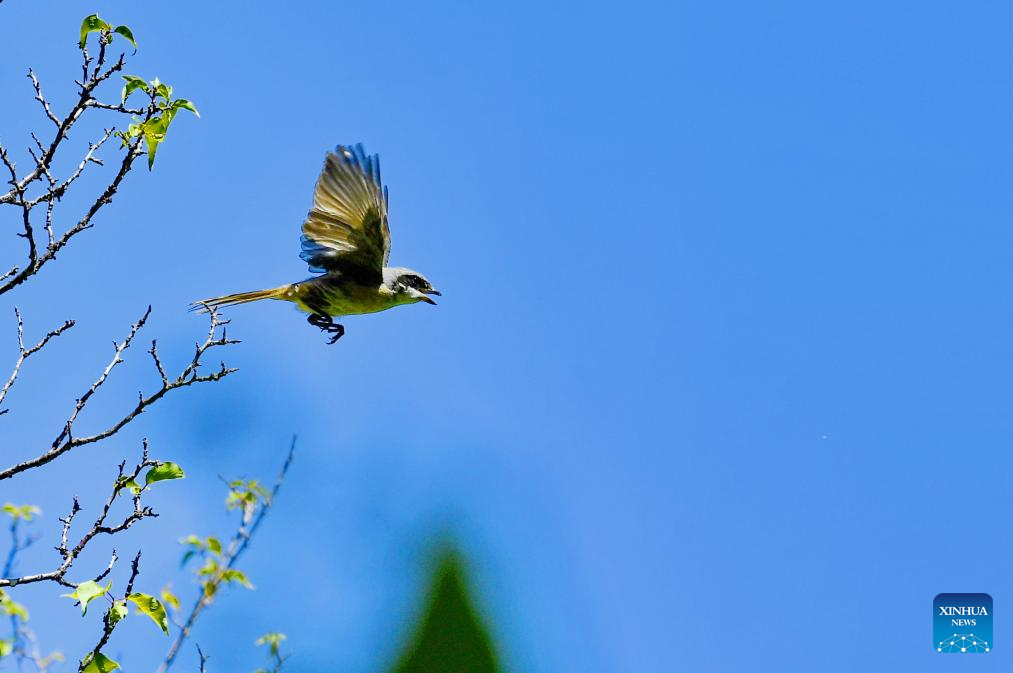 This photo taken on July 28, 2023 shows a shrike flying over the sky in Chengguan District of Lhasa, southwest China's Tibet Autonomous Region. Trees at parks and gardens in Lhasa have been home for birds. In recent years, various measures have been taken to improve the urban and rural environment in Lhasa, which becomes a green and eco-friendly city. (Xinhua/Zhang Rufeng)
