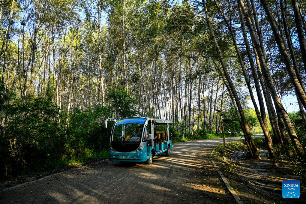A sightseeing electric vehicle moves at the Tao'erhe National Wetland Park in Ulanhot City, north China's Inner Mongolia Autonomous Region, Aug. 13, 2023. (Xinhua/Peng Yuan)