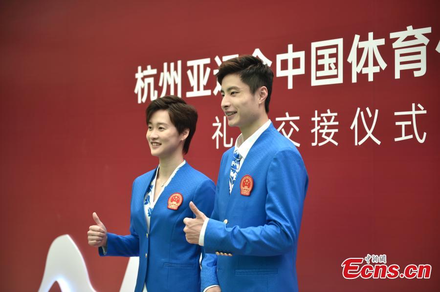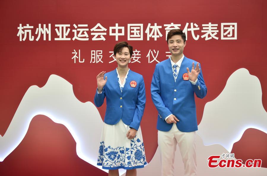 Two athletes model the official Team China opening ceremony parade uniforms for the upcoming Hangzhou Asian Games in Beijing, Aug. 15, 2023. (Photo: China News Network/Li Jun)