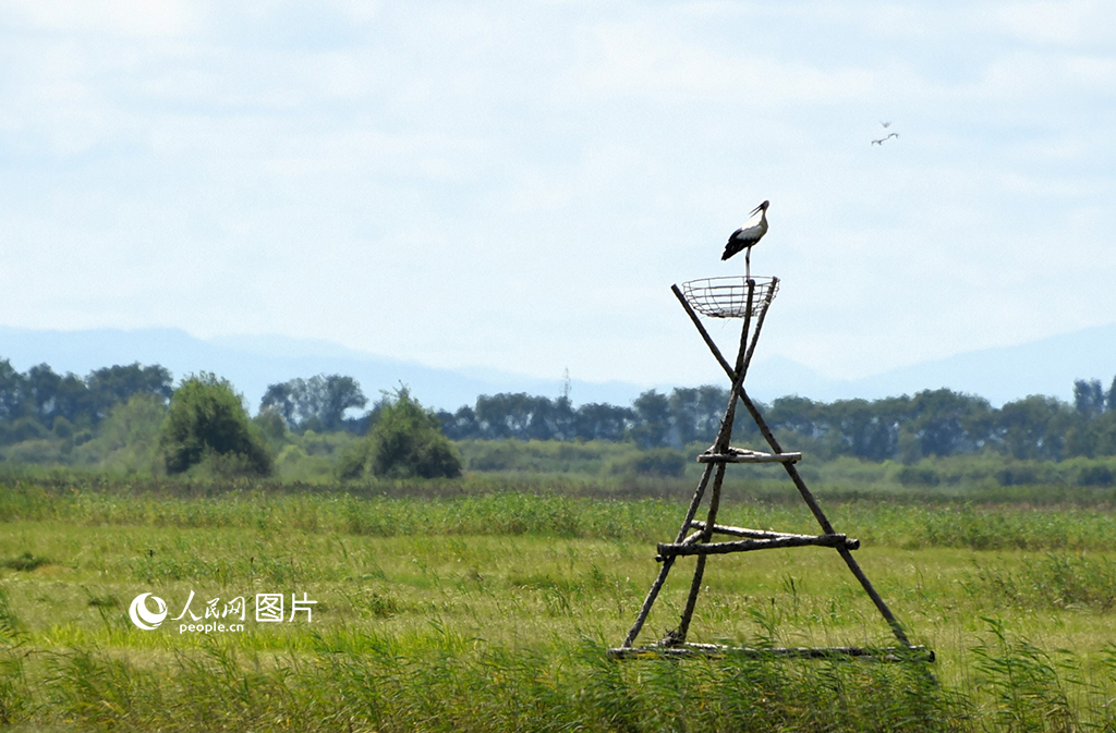An oriental white stork rests on an artificial bird nest at the Qianniao lake wetland of the Naoli River National Nature Reserve in northeast China's Heilongjiang Province, July 31, 2023. (People's Daily Online/Su Jinggang)