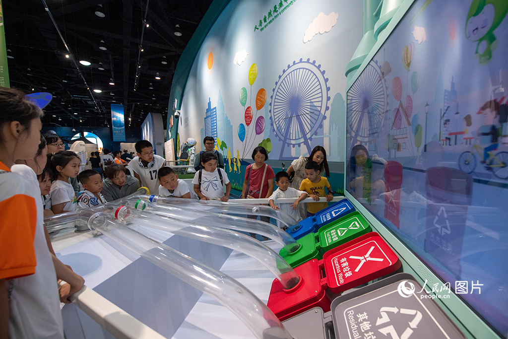 Children learn how to sort garbage at the China Science and Technology Museum in Beijing, July 19, 2023. (People's Daily Online/Weng Qiyu)
