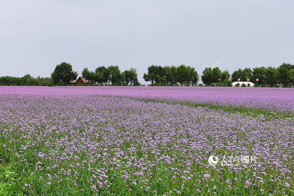 Photo taken on July 10, 2023 shows verbena flowers at Chagan Lake in Qian Gorlos Mongol Autonomous County, northeast China's Jilin Province. In recent years, the ecological environment of Chagan Lake has improved significantly, leading to thriving ecotourism. (People's Daily Online/Wang Diyuan)