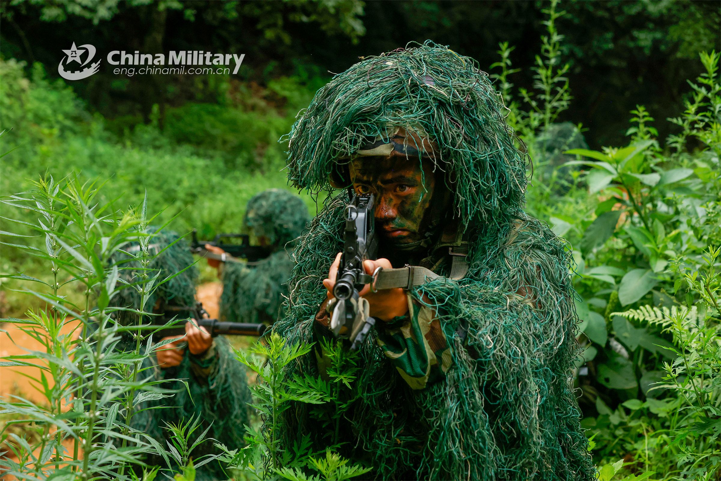 Snipers wearing ghillie suits assigned to a brigade under the PLA 75th Group Army advance to assault mock targets while providing cover to each other during a tactical training exercise on August 4, 2023. (eng.chinamil.com.cn/Photo by Yang Zhao)