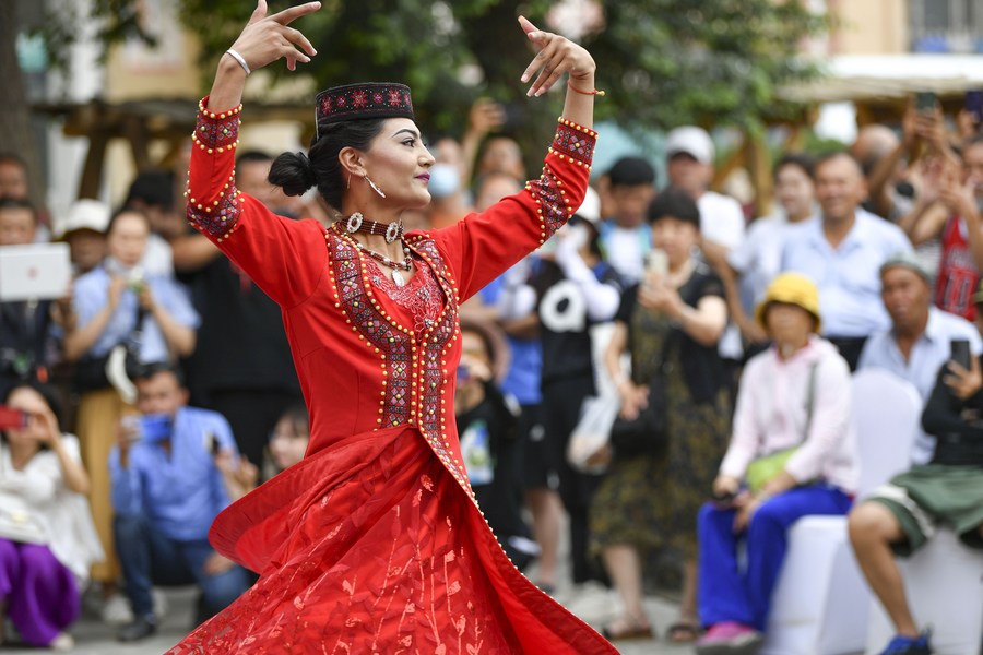 An artist performs a show of intangible cultural heritage in the ancient city of Kashgar scenic area in Kashgar, northwest China's Xinjiang Uygur Autonomous Region, June 14, 2023. (Xinhua/Hu Huhu)
