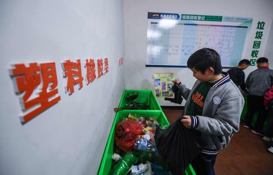 File photo shows students put waste into different baskets at the "Green Bank" in the Central Primary School of Hongxingqiao Township in Changxing County, east China's Zhejiang Province. (Xinhua/Xu Yu)