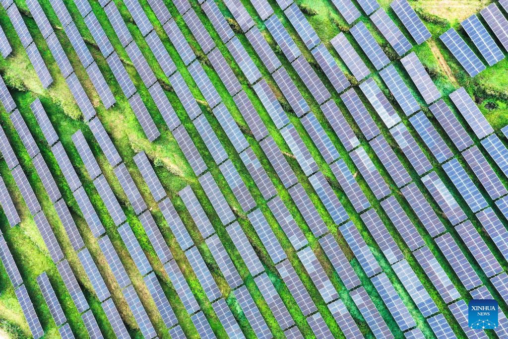 This aerial photo taken on July 20, 2023 shows a photovoltaic power plant in Yi-Hui-Miao Autonomous County of Weining, southwest China's Guizhou Province. Guizhou has seized the opportunity and made big stride in the development of new energy industry, such as wind power and photovoltaic power, in recent years. While vigorously developing green energy, Guizhou has also made full use of the land under photovoltaic panels to develop farming and livestock breeding. By the end of June 2023, the total installed capacity of new energy in Guizhou had reached 21.81 million kilowatts. (Xinhua/Yang Wenbin)