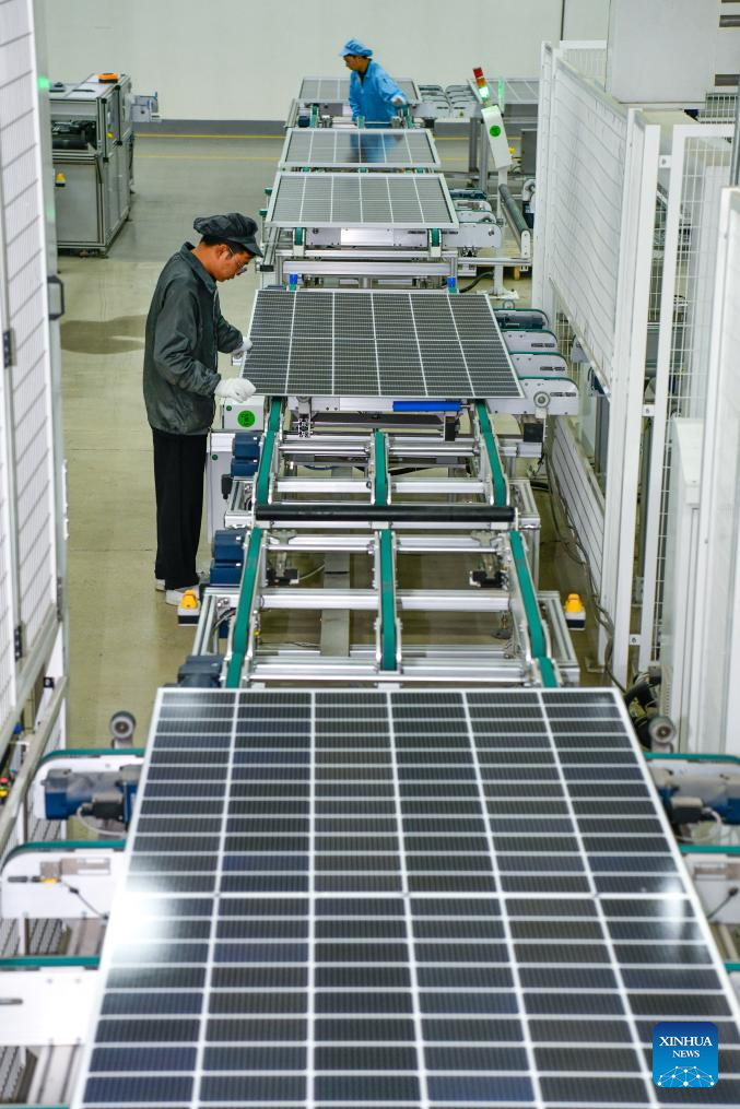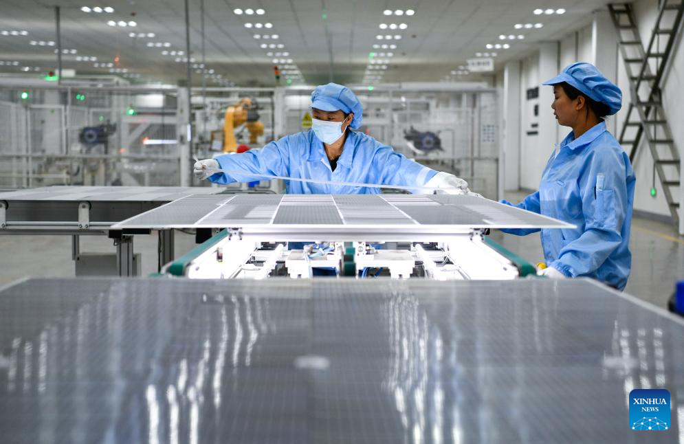 Workers produce photovoltaic modules at the workshop of a new energy company in Yi-Hui-Miao Autonomous County of Weining, southwest China's Guizhou Province, July 19, 2023. Guizhou has seized the opportunity and made big stride in the development of new energy industry, such as wind power and photovoltaic power, in recent years. While vigorously developing green energy, Guizhou has also made full use of the land under photovoltaic panels to develop farming and livestock breeding. By the end of June 2023, the total installed capacity of new energy in Guizhou had reached 21.81 million kilowatts. (Xinhua/Yang Wenbin)