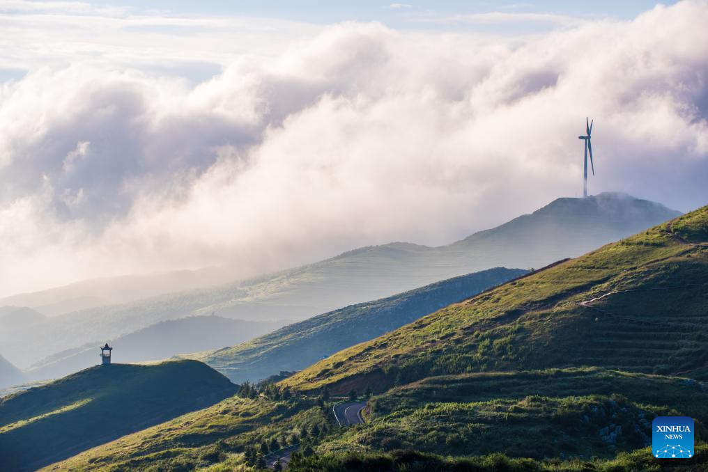 This aerial photo taken on Aug. 19, 2020 shows wind turbines in Hezhang County, southwest China's Guizhou Province. Guizhou has seized the opportunity and made big stride in the development of new energy industry, such as wind power and photovoltaic power, in recent years. While vigorously developing green energy, Guizhou has also made full use of the land under photovoltaic panels to develop farming and livestock breeding. By the end of June 2023, the total installed capacity of new energy in Guizhou had reached 21.81 million kilowatts. (Xinhua/Liu Xu)