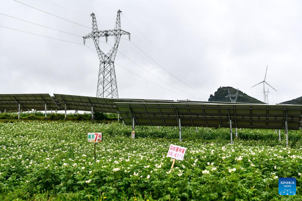 Plants of potatoes are grown under the photovoltaic panels at a photovoltaic power plant in Yi-Hui-Miao Autonomous County of Weining, southwest China's Guizhou Province, July 20, 2023. Guizhou has seized the opportunity and made big stride in the development of new energy industry, such as wind power and photovoltaic power, in recent years. While vigorously developing green energy, Guizhou has also made full use of the land under photovoltaic panels to develop farming and livestock breeding. By the end of June 2023, the total installed capacity of new energy in Guizhou had reached 21.81 million kilowatts. (Xinhua/Yang Wenbin)