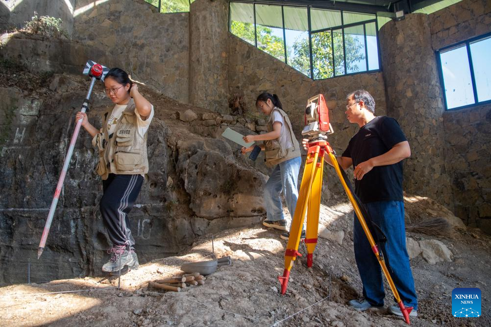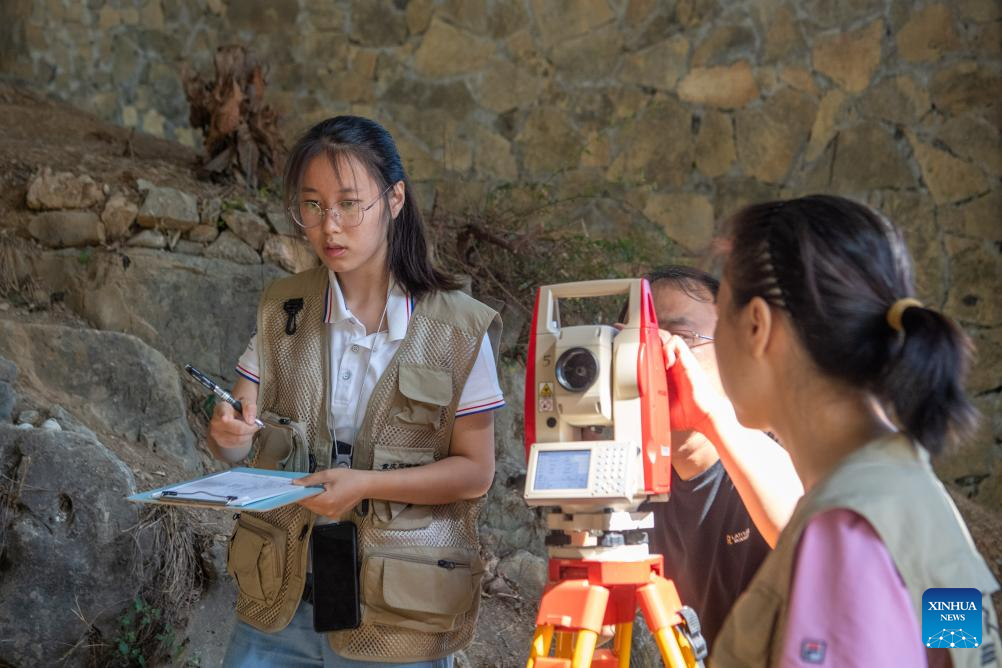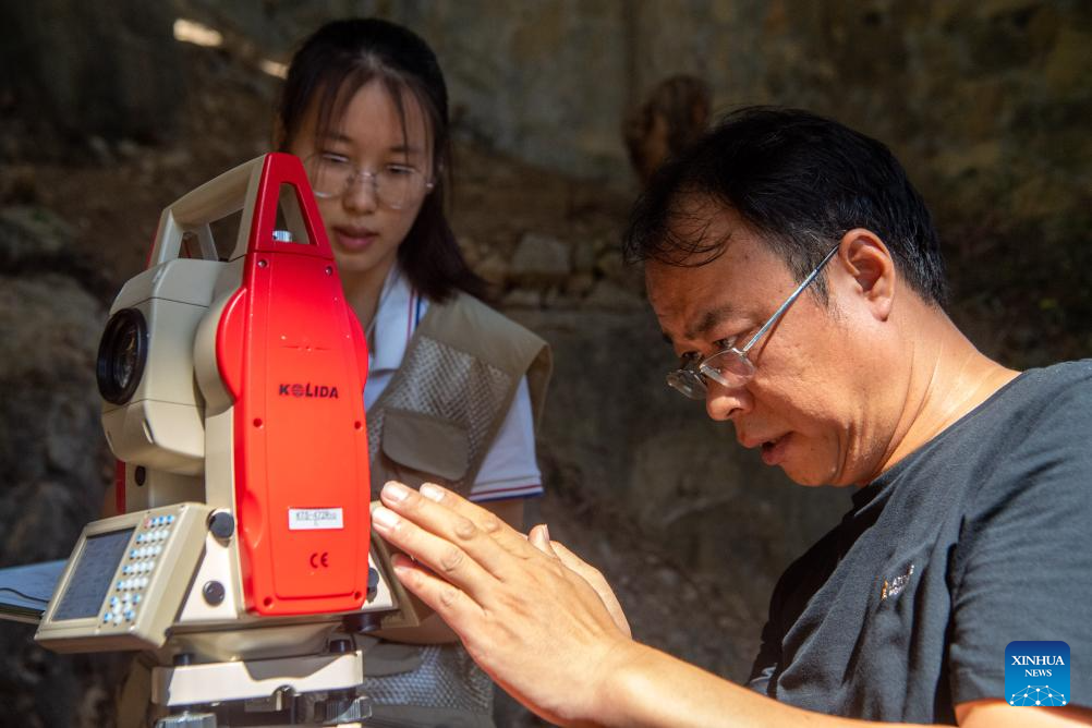 Staff members conduct survey operation at the Longgupo Site in Wushan County, southwest China's Chongqing, on Aug. 16, 2023. Longgupo Site officially started the fifth stage of excavation on Wednesday, and researchers are expected to find more about ancient humans, fossils and related artifacts there. (Xinhua/Tang Yi)