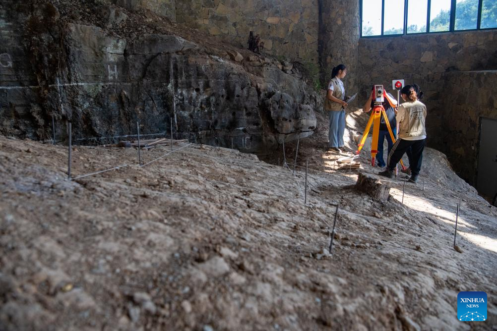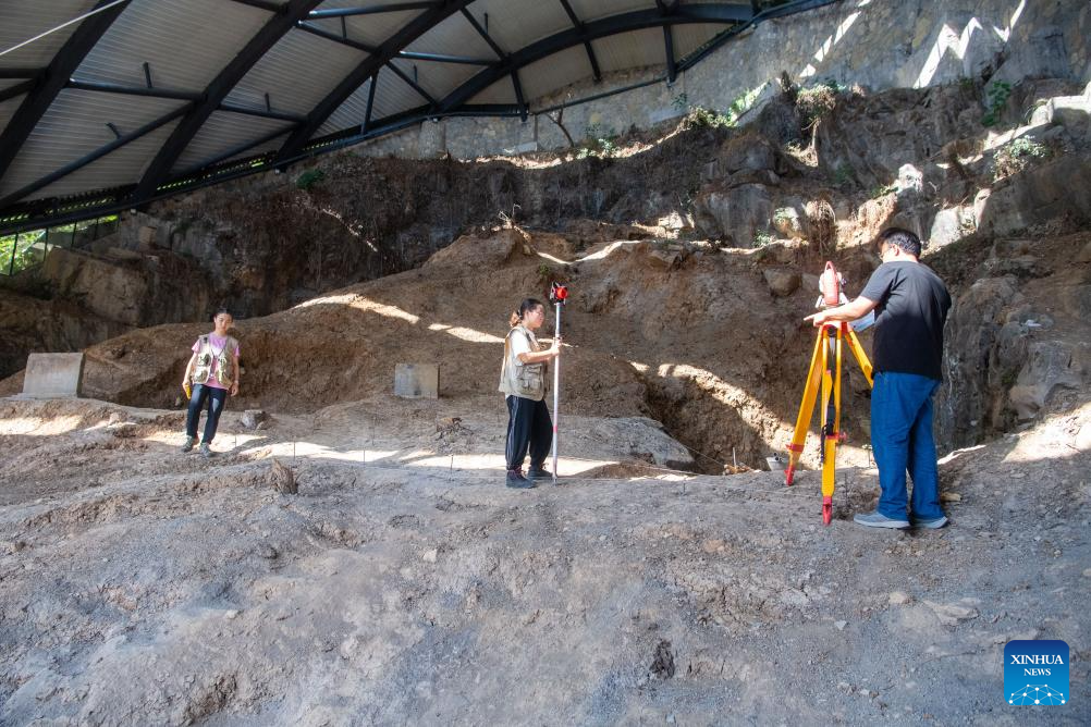 Staff members conduct survey operation at the Longgupo Site in Wushan County, southwest China's Chongqing, on Aug. 16, 2023. Longgupo Site officially started the fifth stage of excavation on Wednesday, and researchers are expected to find more about ancient humans, fossils and related artifacts there.?(Xinhua/Tang Yi)