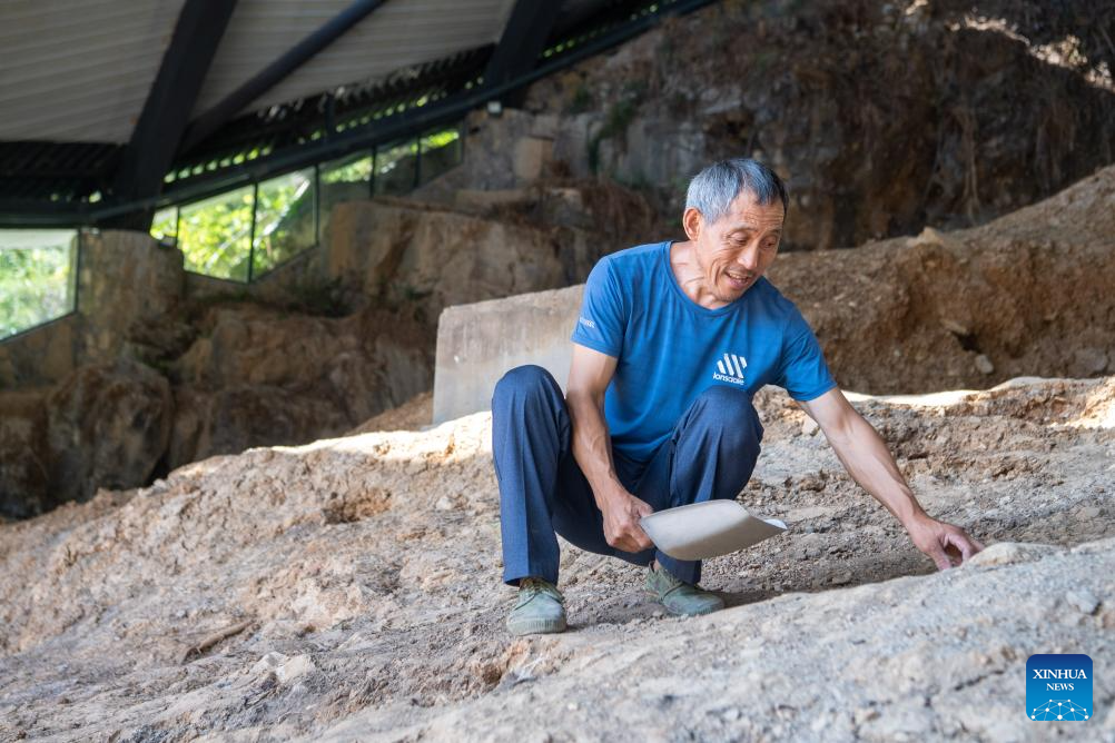 A staff member does cleaning work at the Longgupo Site in Wushan County, southwest China's Chongqing, on Aug. 16, 2023. Longgupo Site officially started the fifth stage of excavation on Wednesday, and researchers are expected to find more about ancient humans, fossils and related artifacts there.?(Xinhua/Tang Yi)