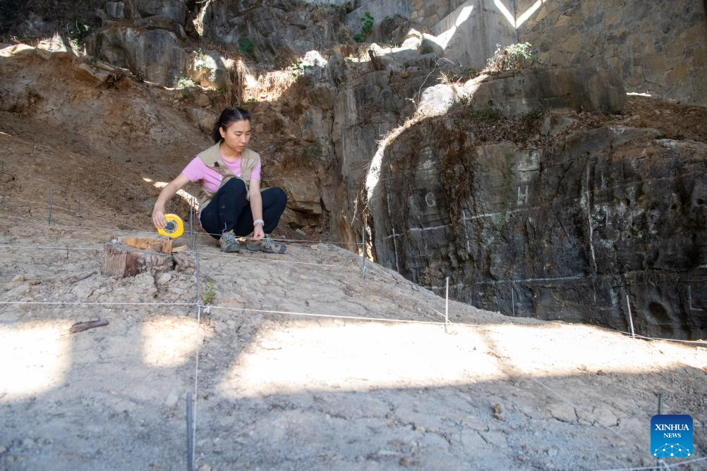 A staff member conducts survey operation at the Longgupo Site in Wushan County, southwest China's Chongqing, on Aug. 16, 2023. Longgupo Site officially started the fifth stage of excavation on Wednesday, and researchers are expected to find more about ancient humans, fossils and related artifacts there.?(Xinhua/Tang Yi)