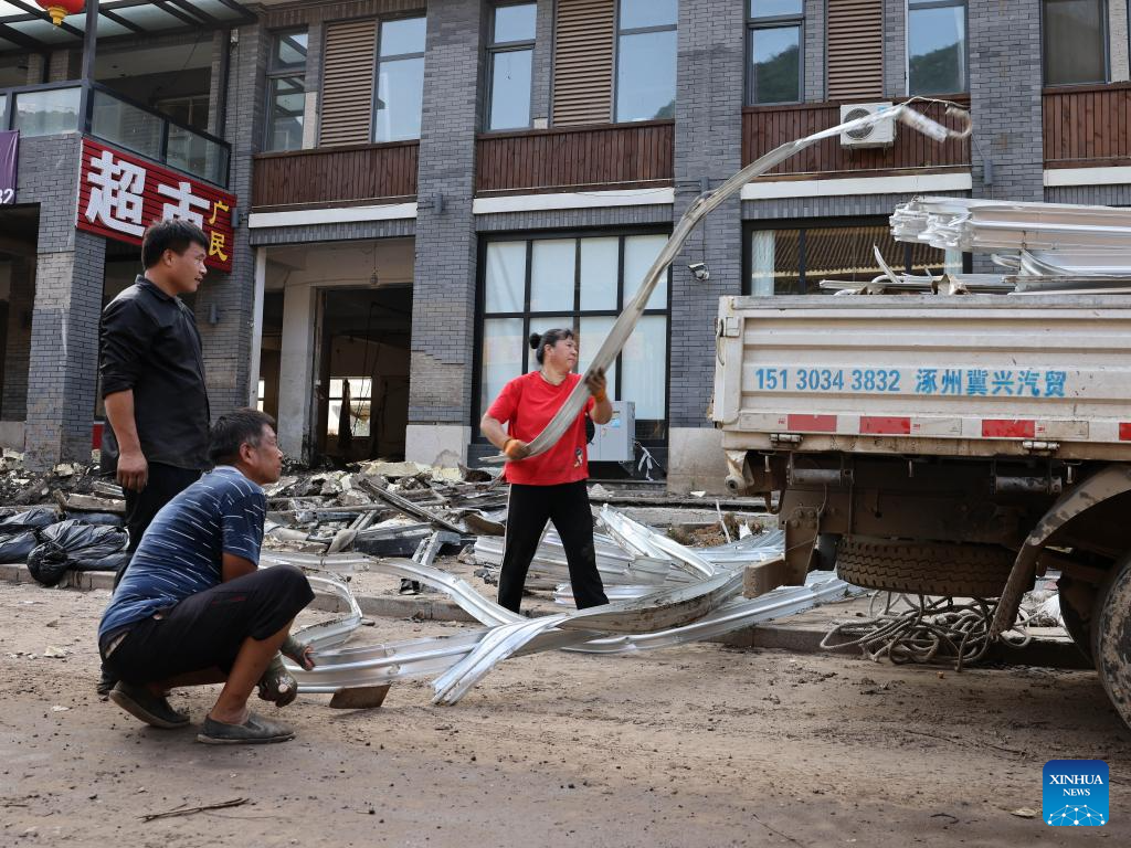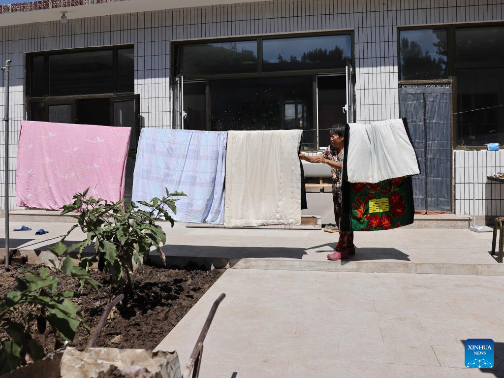 A villager dries quilts in Beilongmen Village, Jiulong Township, Laishui County of north China's Hebei Province, Aug. 16, 2023. Laishui County has suffered heavy rainfall due to the impact of Typhoon Doksuri recently. The local authorities have actively carried out post-disaster emergency reconstruction to ensure that residents stay safe and help floods-hit regions back on track. (Xinhua/Luo Xuefeng)