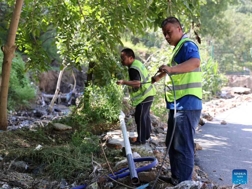 Staff members clean a street at a scenic area in Laishui County, north China's Hebei Province, Aug. 15, 2023. Laishui County has suffered heavy rainfall due to the impact of Typhoon Doksuri recently. The local authorities have actively carried out post-disaster emergency reconstruction to ensure that residents stay safe and help floods-hit regions back on track. (Xinhua/Luo Xuefeng)