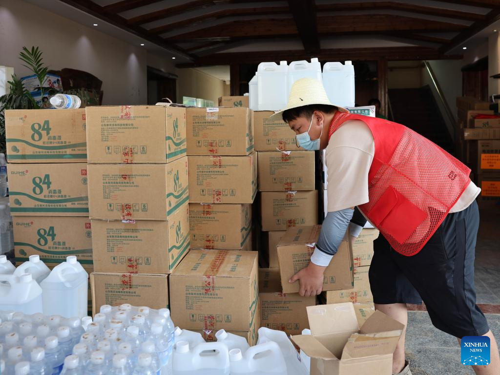 A staff member carries disinfection materials in Sanpo Township of Laishui County, north China's Hebei Province, Aug. 15, 2023. Laishui County has suffered heavy rainfall due to the impact of Typhoon Doksuri recently. The local authorities have actively carried out post-disaster emergency reconstruction to ensure that residents stay safe and help floods-hit regions back on track. (Xinhua/Luo Xuefeng)
