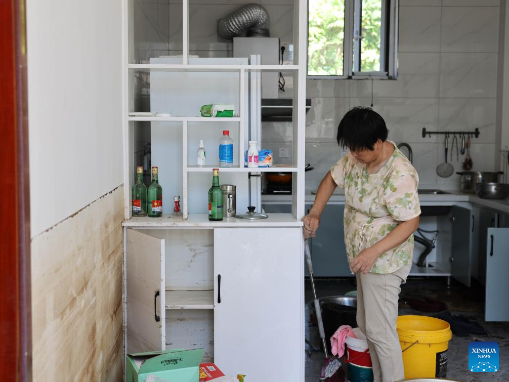 A villager cleans furniture at her home in Beilongmen Village, Jiulong Township, Laishui County of north China's Hebei Province, Aug. 16, 2023. Laishui County has suffered heavy rainfall due to the impact of Typhoon Doksuri recently. The local authorities have actively carried out post-disaster emergency reconstruction to ensure that residents stay safe and help floods-hit regions back on track. (Xinhua/Luo Xuefeng)