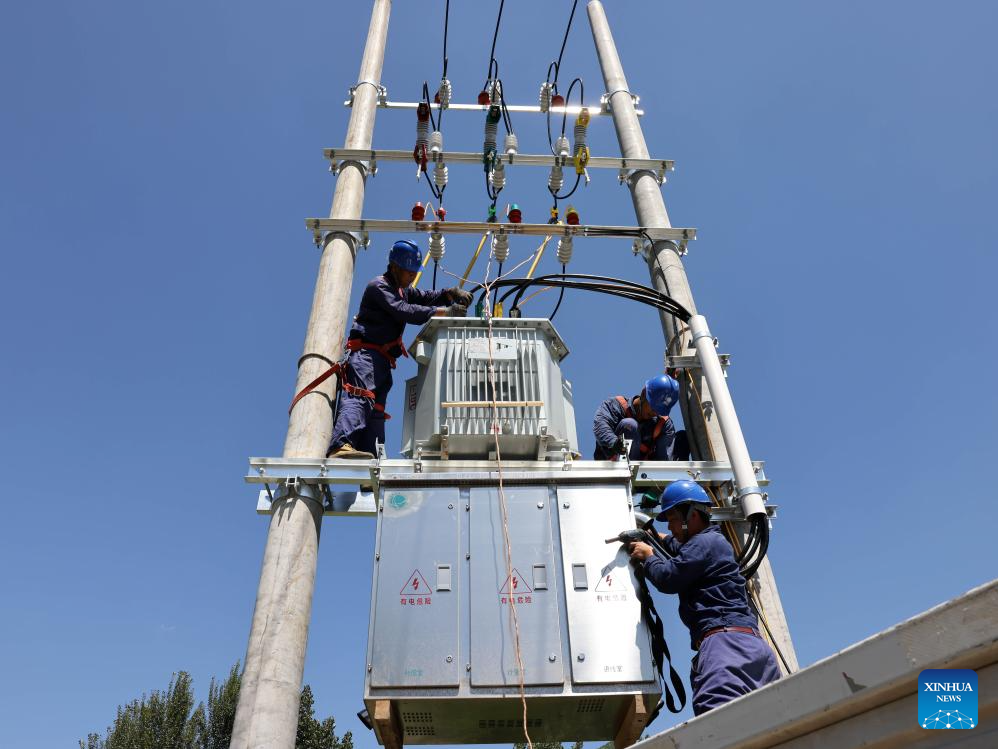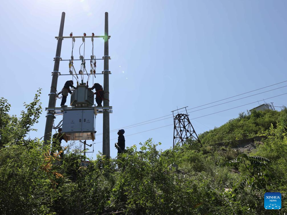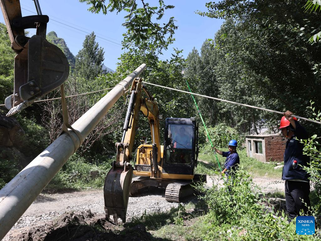 Workers repair a power facility in Beilongmen Village, Jiulong Township, Laishui County of north China's Hebei Province, Aug. 16, 2023. Laishui County has suffered heavy rainfall due to the impact of Typhoon Doksuri recently. The local authorities have actively carried out post-disaster emergency reconstruction to ensure that residents stay safe and help floods-hit regions back on track. (Xinhua/Luo Xuefeng)