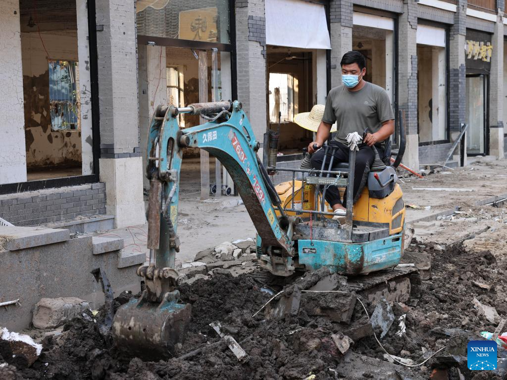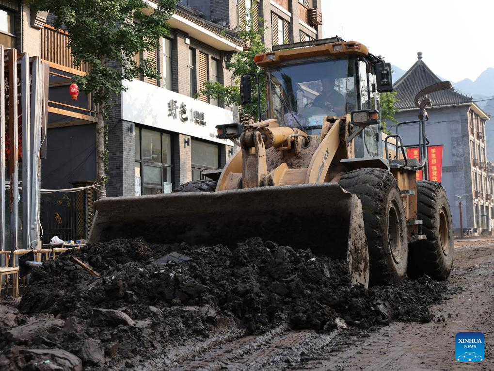 A staff member operates a machinery to clean up silt at a scenic area in Laishui County, north China's Hebei Province, Aug. 15, 2023. Laishui County has suffered heavy rainfall due to the impact of Typhoon Doksuri recently. The local authorities have actively carried out post-disaster emergency reconstruction to ensure that residents stay safe and help floods-hit regions back on track. (Xinhua/Luo Xuefeng)