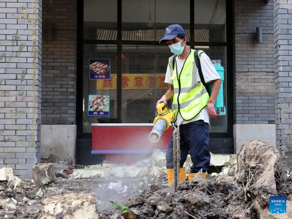 A staff member conducts disinfection at a scenic area in Laishui County, north China's Hebei Province, Aug. 15, 2023. Laishui County has suffered heavy rainfall due to the impact of Typhoon Doksuri recently. The local authorities have actively carried out post-disaster emergency reconstruction to ensure that residents stay safe and help floods-hit regions back on track. (Xinhua/Luo Xuefeng)