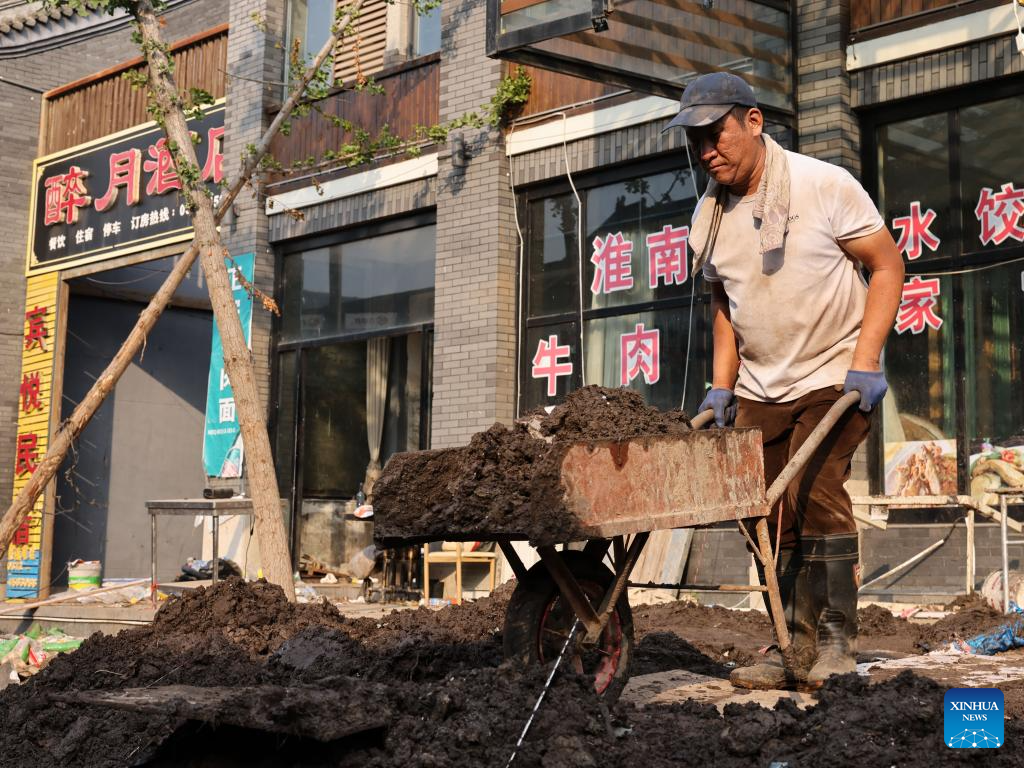 A staff member cleans up silt at a scenic area in Laishui County, north China's Hebei Province, Aug. 15, 2023. Laishui County has suffered heavy rainfall due to the impact of Typhoon Doksuri recently. The local authorities have actively carried out post-disaster emergency reconstruction to ensure that residents stay safe and help floods-hit regions back on track. (Xinhua/Luo Xuefeng)
