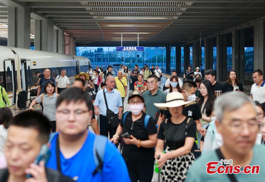 Passengers get off a train at Chaoyang Railway Station in Beijing, Aug. 16, 2023. (Photo: China News Service/Jia Tianyong)