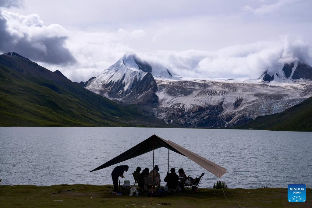 Tourists enjoy the lake scenery at the foot of the Sapukonglagabo Mountain in Biru County of Nagqu, southwest China's Tibet Autonomous Region, Aug. 16, 2023. (Xinhua/Jiang Fan)