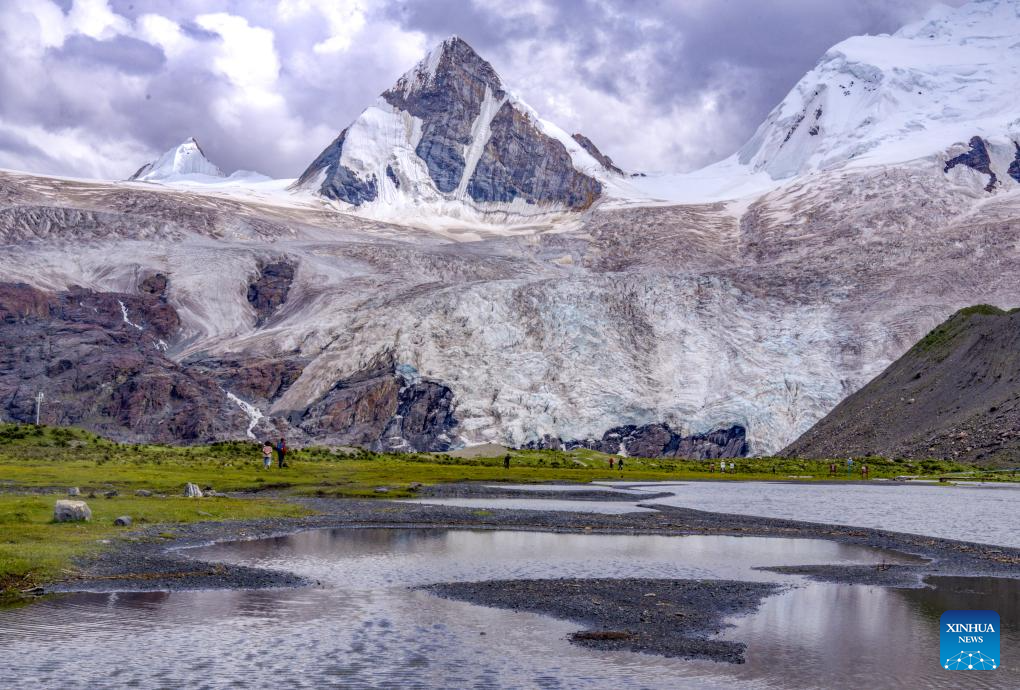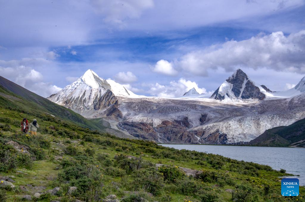 Tourists take a walk by the lake at the foot of the Sapukonglagabo Mountain in Biru County of Nagqu, southwest China's Tibet Autonomous Region, Aug. 16, 2023. (Xinhua/Jiang Fan)