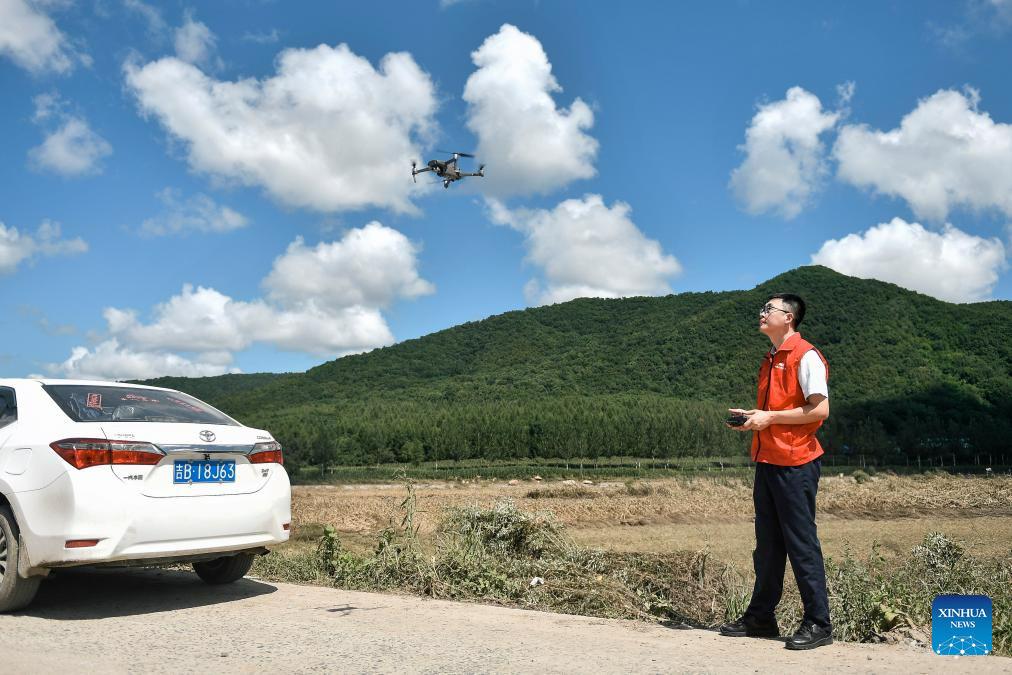An insurance adjuster operates a drone to check the farmland after heavy rainfall near Jinma Town of Shulan City, northeast China's Jilin Province, Aug. 15, 2023. Heavy rainfall inflicted significant damage in Shulan City. The local government has ramped up efforts to repair roads, restore power supply, relocate affected people, carry out disinfection and monitor the weather and water quality in order to expedite the recovery of production and daily life for the affected population. (Xinhua/Xu Chang)