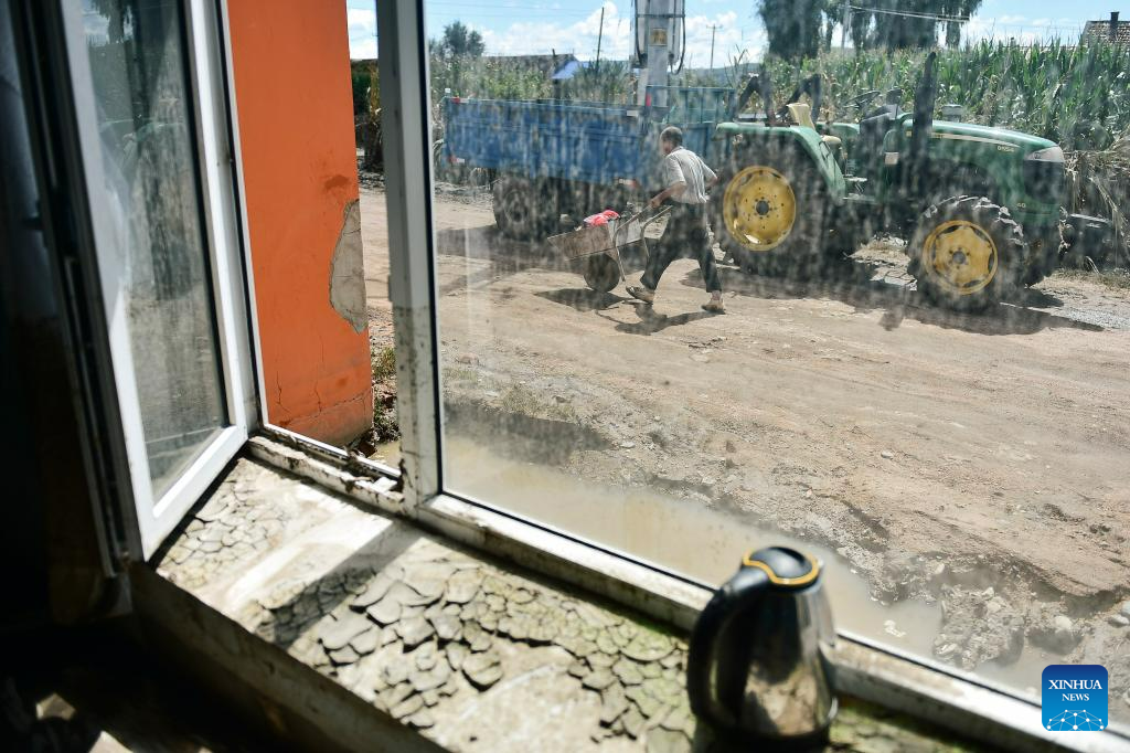 A villager transports waste from his home at Changsheng Village of Shulan City, northeast China's Jilin Province, Aug. 15, 2023. Heavy rainfall inflicted significant damage in Shulan City. The local government has ramped up efforts to repair roads, restore power supply, relocate affected people, carry out disinfection and monitor the weather and water quality in order to expedite the recovery of production and daily life for the affected population. (Xinhua/Xu Chang)