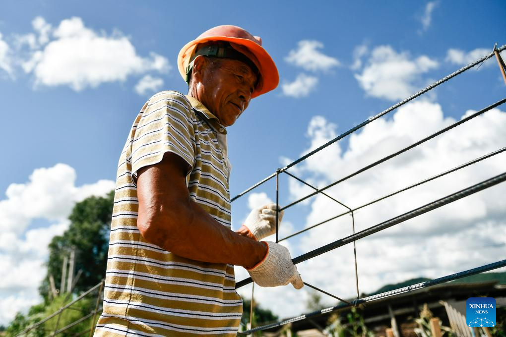 A staff member rebuilds the damaged houses in Mofan Village of Shulan City, northeast China's Jilin Province, Aug. 16, 2023. Heavy rainfall inflicted significant damage in Shulan City. The local government has ramped up efforts to repair roads, restore power supply, relocate affected people, carry out disinfection and monitor the weather and water quality in order to expedite the recovery of production and daily life for the affected population. (Xinhua/Xu Chang)