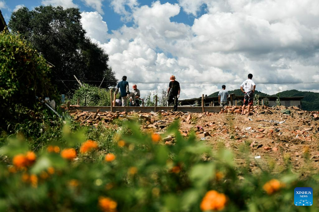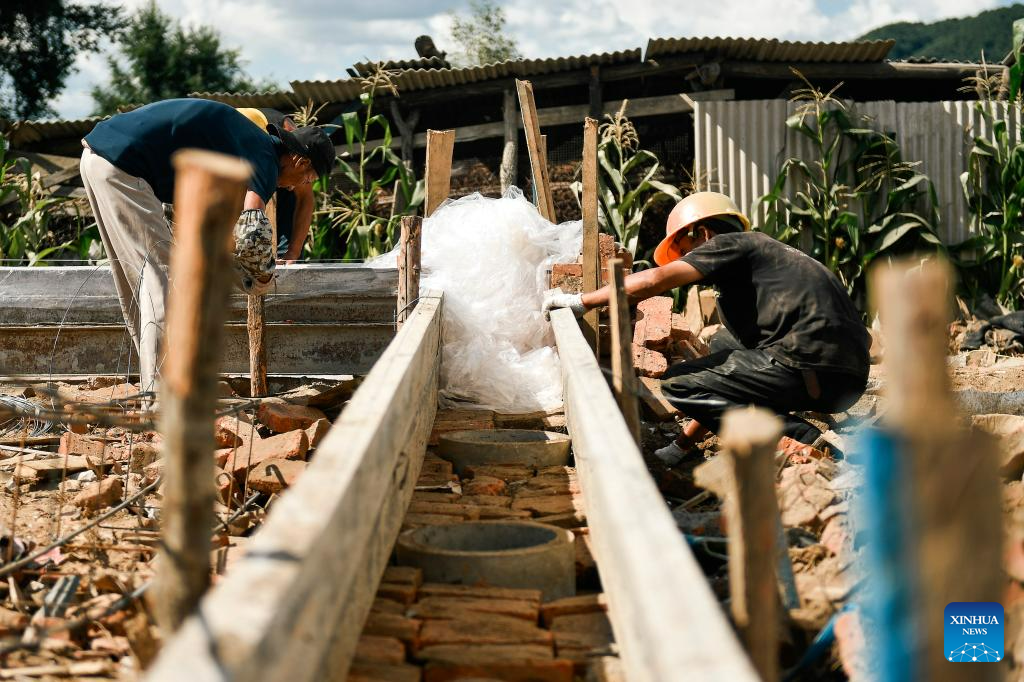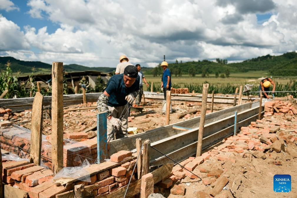 Staff members rebuild the damaged houses in Mofan Village of Shulan City, northeast China's Jilin Province, Aug. 16, 2023. Heavy rainfall inflicted significant damage in Shulan City. The local government has ramped up efforts to repair roads, restore power supply, relocate affected people, carry out disinfection and monitor the weather and water quality in order to expedite the recovery of production and daily life for the affected population. (Xinhua/Xu Chang)