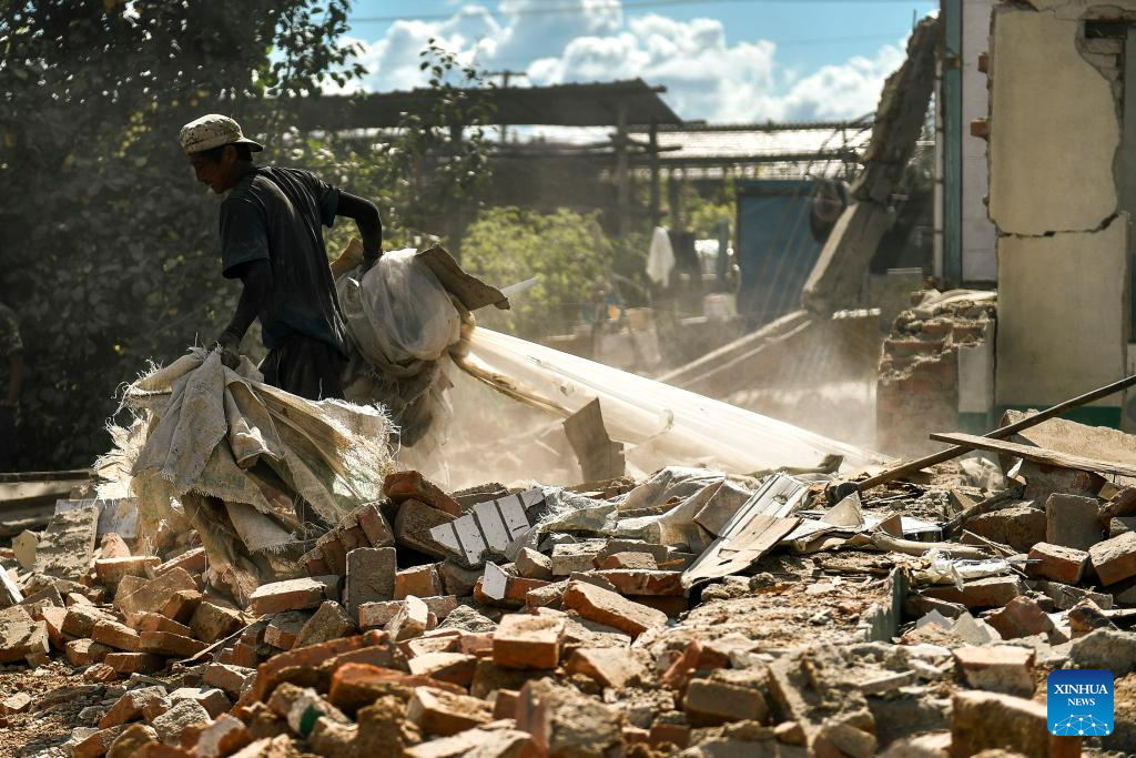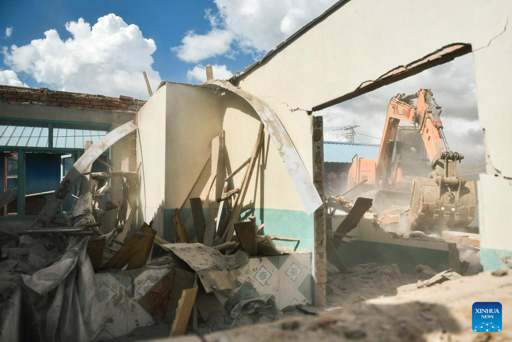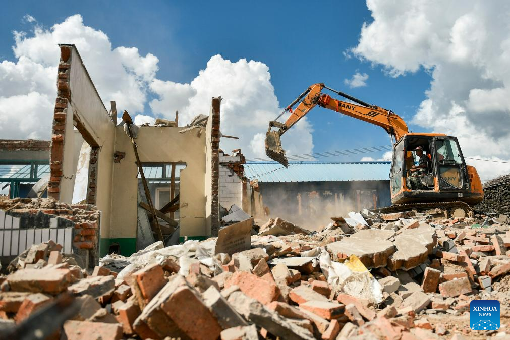 A staff member demolishes and rebuilds the damaged houses in Mofan Village of Shulan City, northeast China's Jilin Province, Aug. 16, 2023. Heavy rainfall inflicted significant damage in Shulan City. The local government has ramped up efforts to repair roads, restore power supply, relocate affected people, carry out disinfection and monitor the weather and water quality in order to expedite the recovery of production and daily life for the affected population. (Xinhua/Xu Chang)