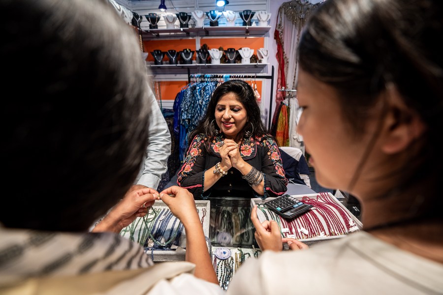 An exhibitor introduces products from India at the seventh China-South Asia Expo in Kunming, southwest China's Yunnan Province, Aug. 16, 2023. (Xinhua/Hu Chao)