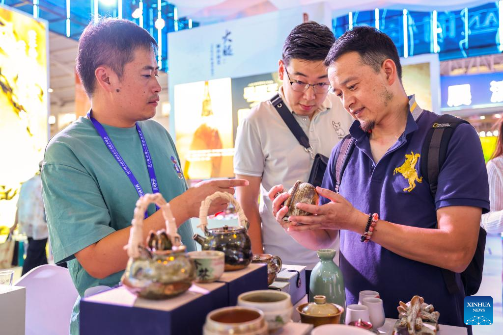An exhibitor (L) introduces pottery products to visitors at the 7th China-South Asia Exposition in Kunming, southwest China's Yunnan Province, Aug. 17, 2023. The 7th China-South Asia Exposition opened here on Wednesday. (Xinhua/Cui Wen)