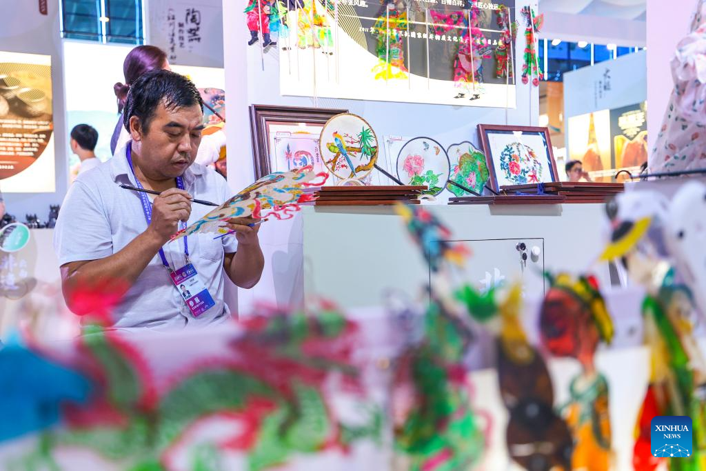 An exhibitor paints a Chinese shadow puppet at the 7th China-South Asia Exposition in Kunming, southwest China's Yunnan Province, Aug. 17, 2023. The 7th China-South Asia Exposition opened here on Wednesday. (Xinhua/Cui Wen)