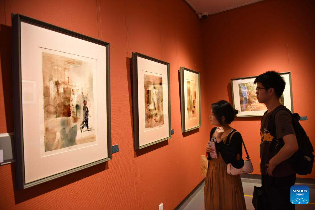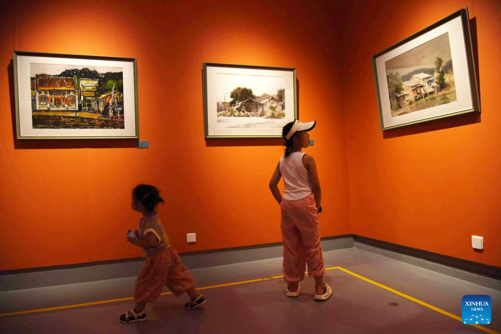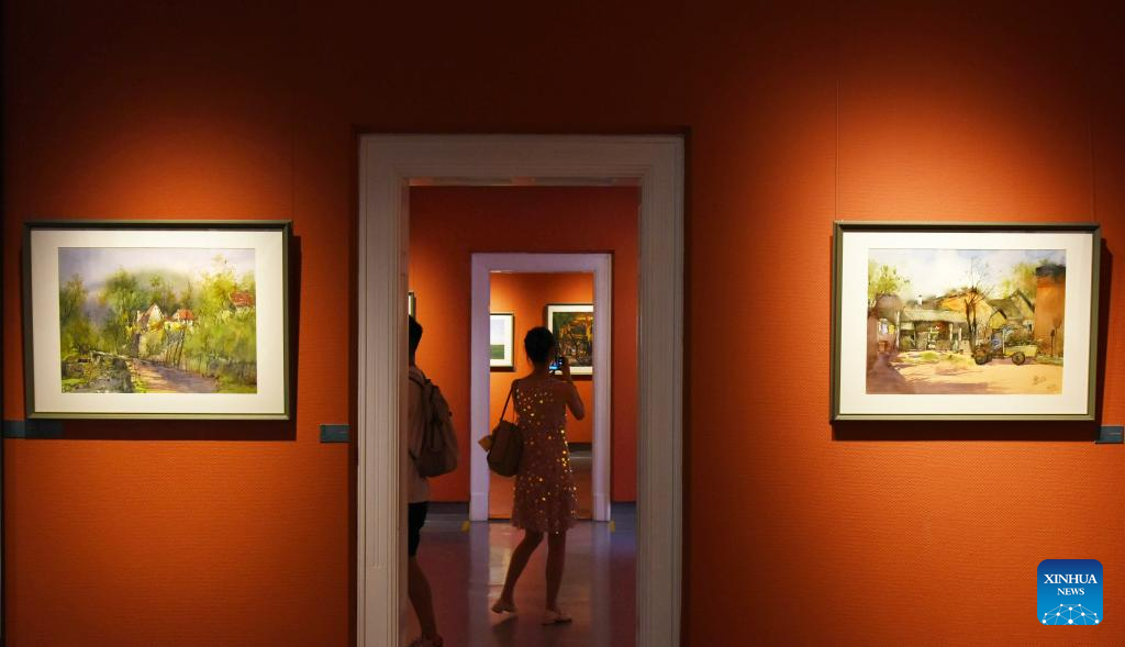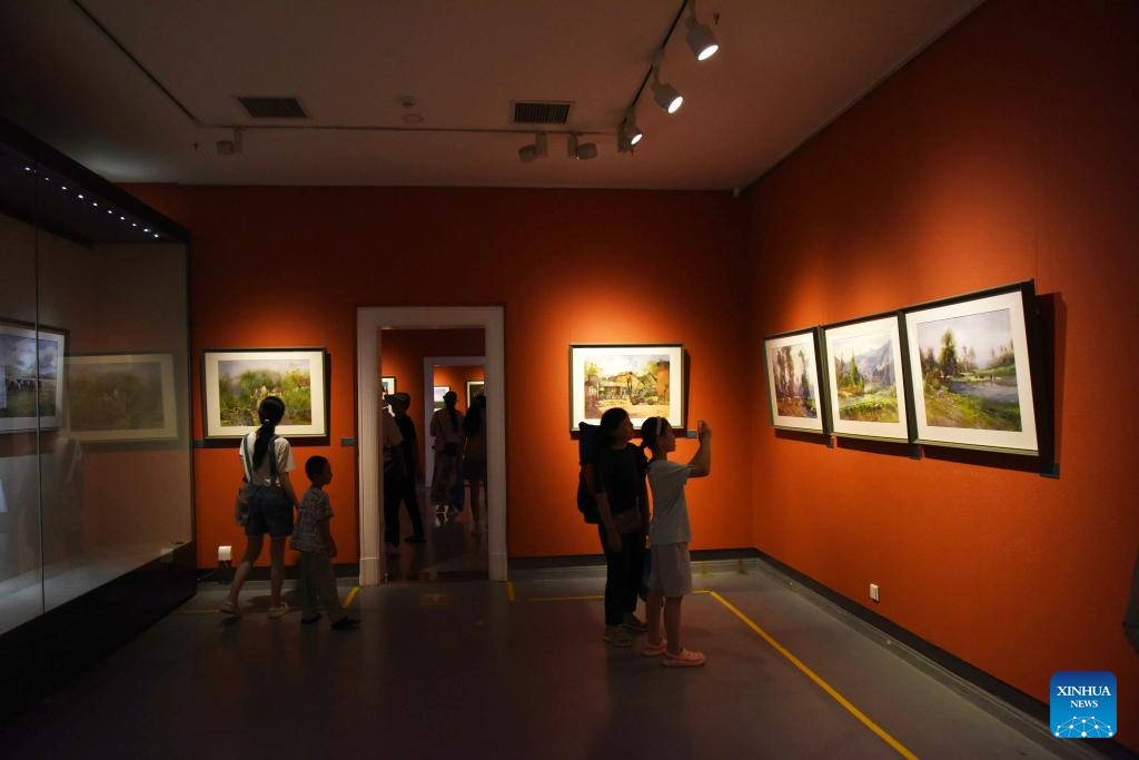 Visitors look at watercolor paintings during an exhibition at Qingdao Art Museum in Shinan District of Qingdao, east China's Shandong Province, Aug. 17, 2023. The exhibition features 120 watercolor paintings of 40 artists from across the country. (Xinhua/Li Ziheng)