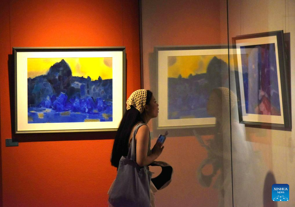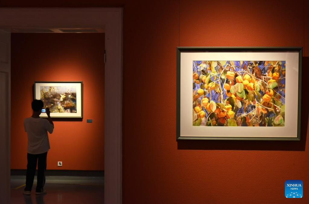 A visitor looks at a watercolor painting during an exhibition at Qingdao Art Museum in Shinan District of Qingdao, east China's Shandong Province, Aug. 17, 2023. The exhibition features 120 watercolor paintings of 40 artists from across the country. (Xinhua/Li Ziheng)